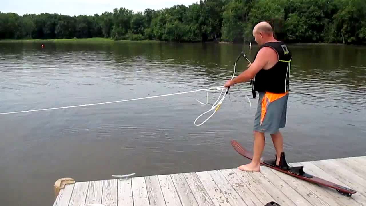 Teen boy hits himself in the crotch while jumping very high on a pogo stick, doing trick moves where he crosses his legs.