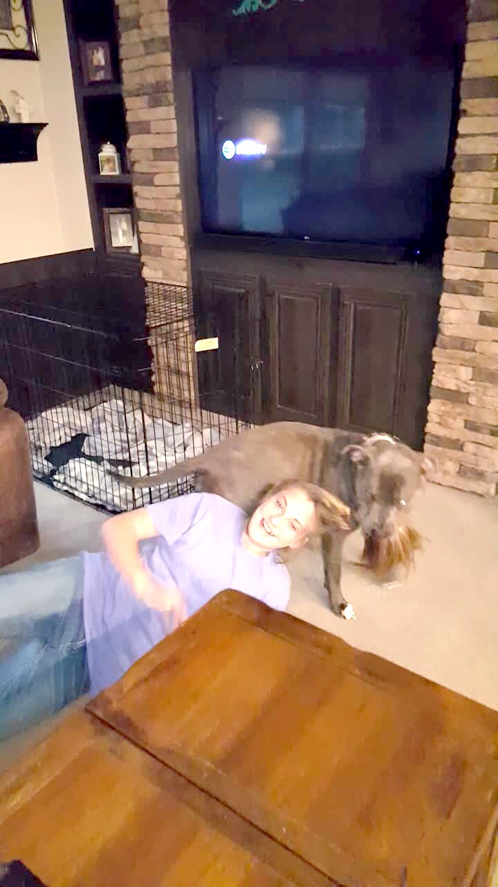 A teen girl holds a yellow Labrador retriever dog in a living room, and the dog swings her back legs frantically around in midair.