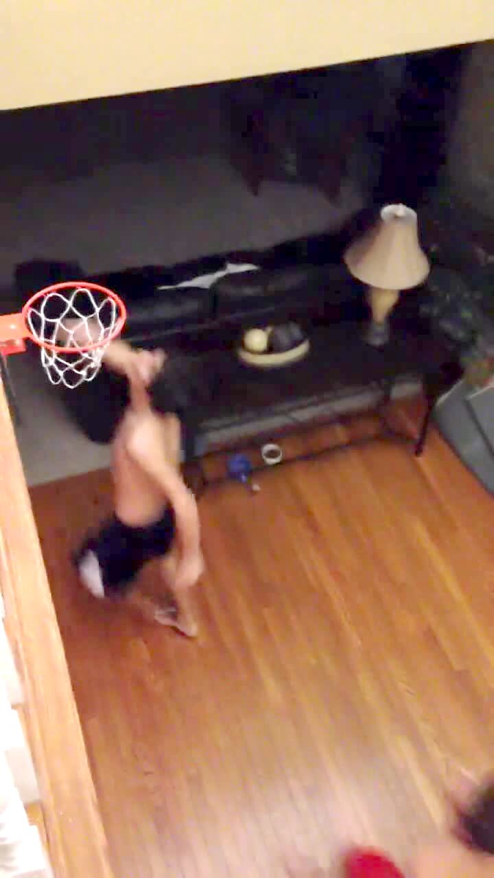 Man tries to step on a chair & jump off it while slam dunking a basketball. The chair slips & man falls down. Good recovery.