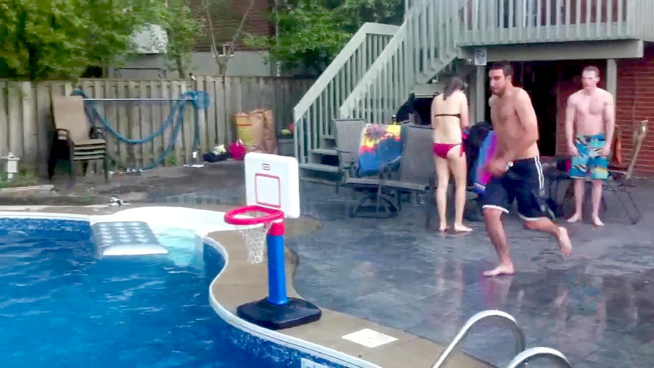 Man tries to jump over a Little Tykes basketball hoop and into the pool. He slips and falls instead.