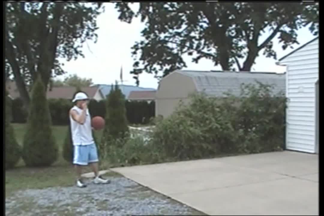 Man tries to walk on an exercise ball in the backyard but falls off. He hurts his back & can't get up. Bonehead. Night.