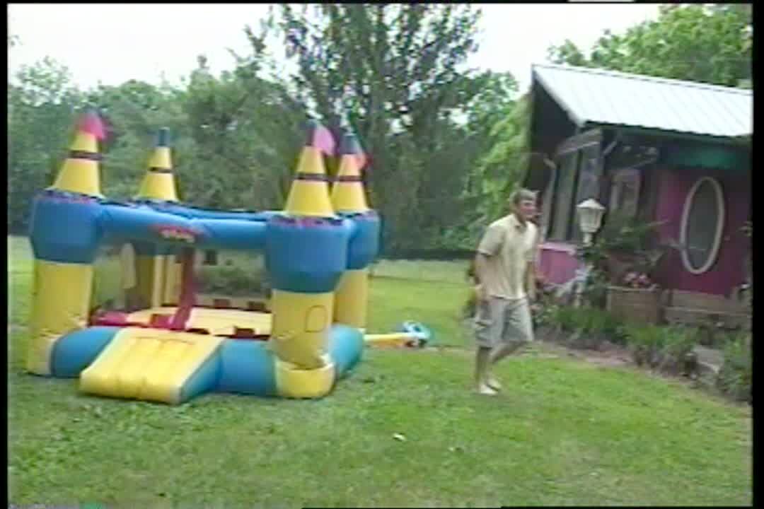 Man tries to jump off a playhouse onto a trampoline, he slips and falls on the trampoline. Bonehead.