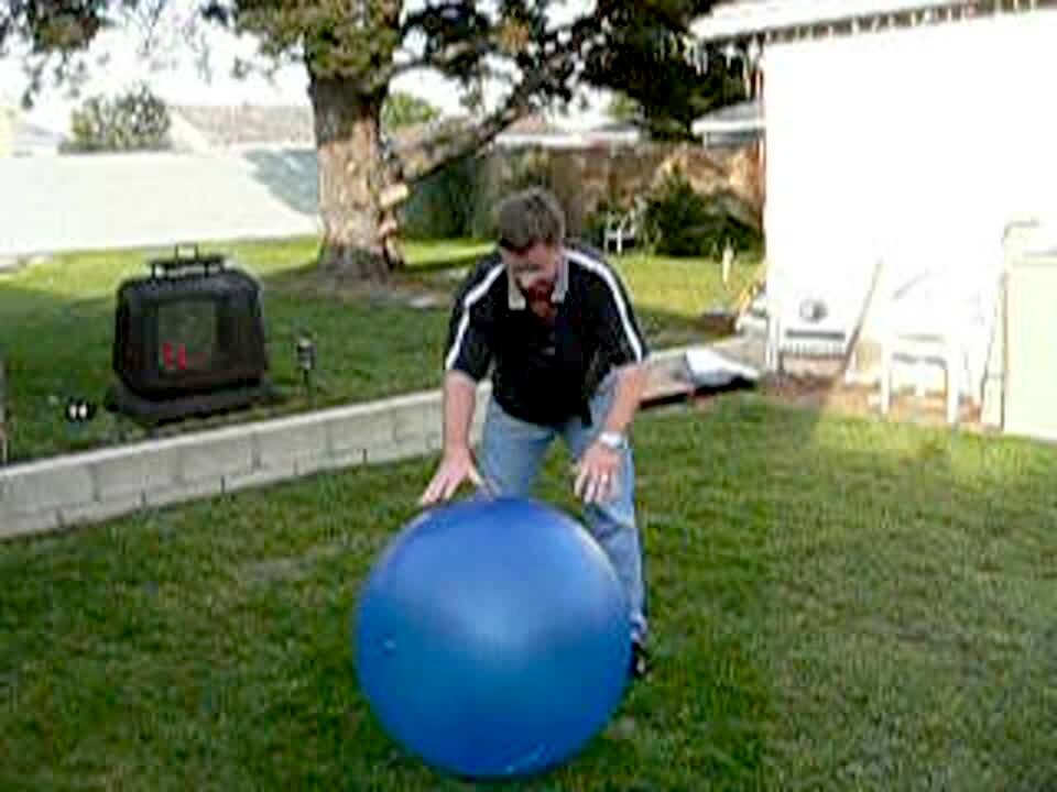 Man tries to stand on blue exercise ball in yard, ball slips out from under him, man falls hard onto his back. Boneheads. Yoga balls.