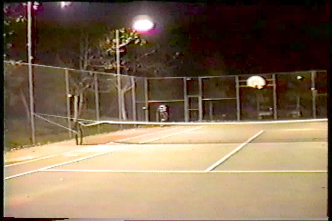 Man watches buddy jump over tennis net 2x, thinks he can do it, falls over it hard. Bonehead.