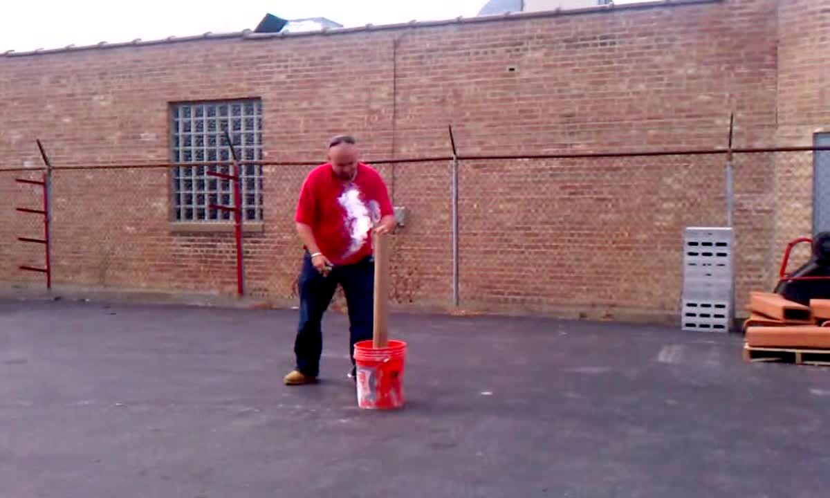 On a concrete parking lot, a man lights the fuse of a mortar firework, where the mortar tube is buried in a bucket filled with dirt. The short fuse immediately burns down and the mortar launches, kicking the bucket into the air and spreading dirt and sand around. The mortar explodes in the air quickly.