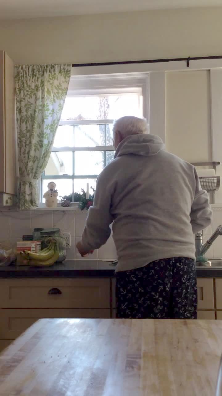 A senior man lights fireworks indoors and throws them out a window. He accidentally drops one in the sink and runs away while it explodes.
