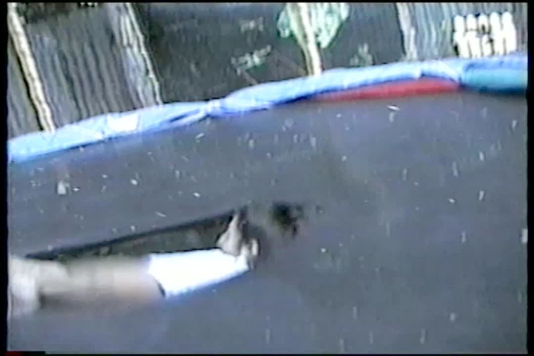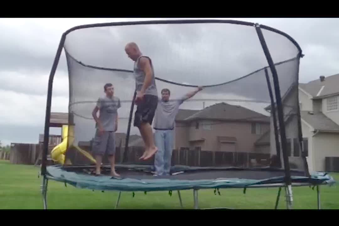 A man does a backflip on a trampoline and falls through the mesh safety net at 0:23.