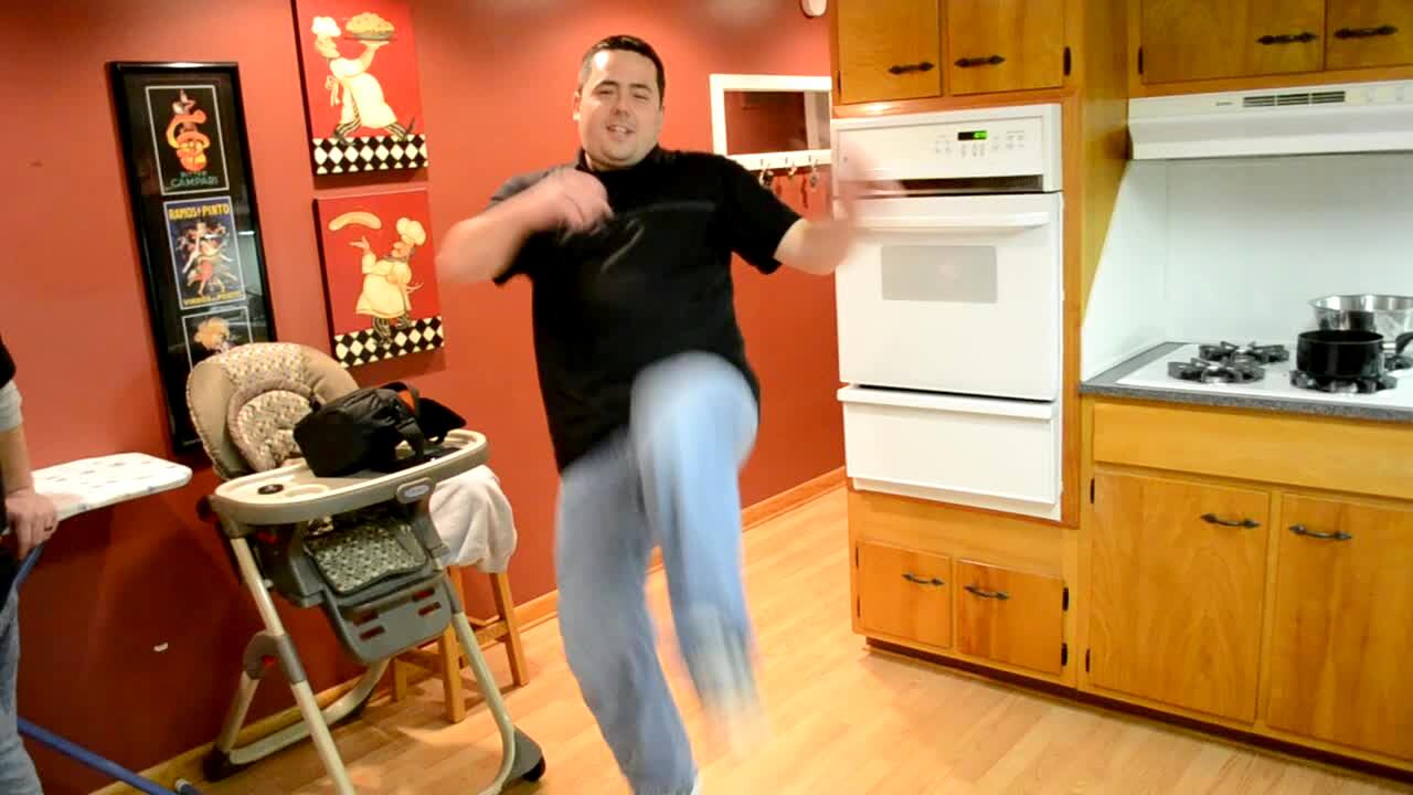 A man dances in a dining room and falls down. Music rights not cleared.