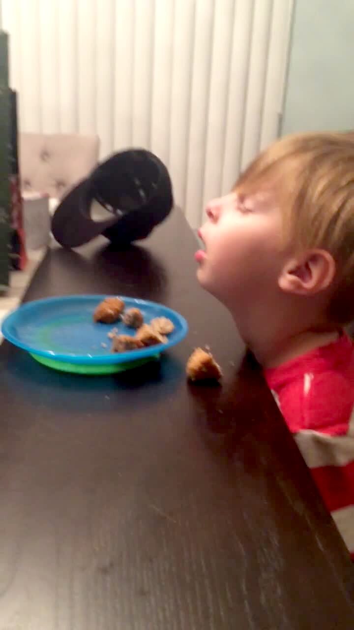 A kitten sneezes repeatedly for 7 seconds and a piece of food flies out of it in the kitchen indoors.