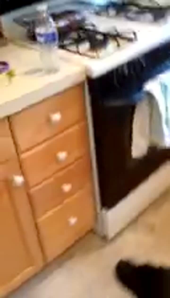 A cat struggles to walk in a pink shirt in a kitchen and falls face first into a bowl of food. Action starts at :50.