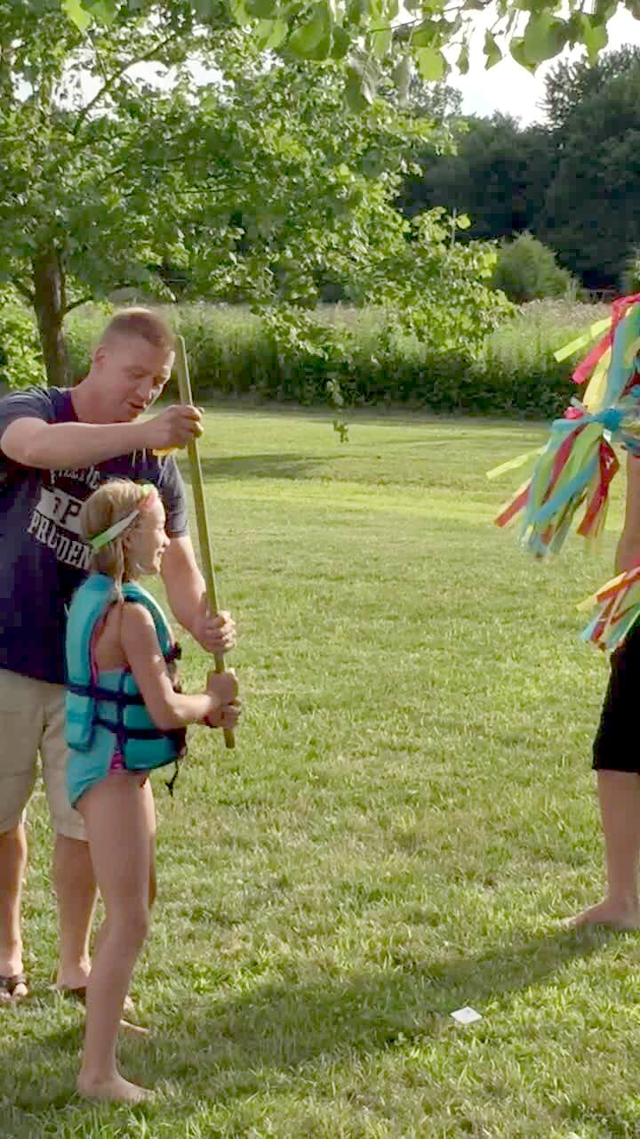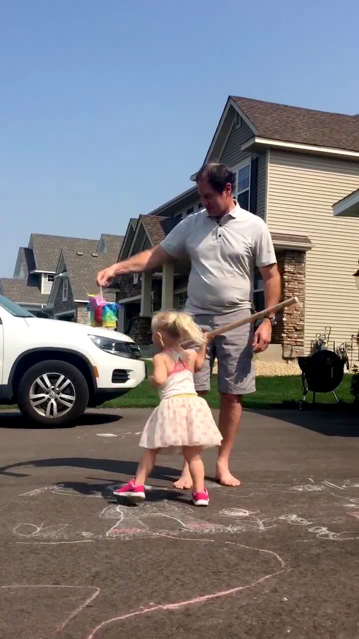 A man holds a small pinata up for his granddaughter to hit in the driveway outdoors. The little girl swings her stick and hits the man in the groin.