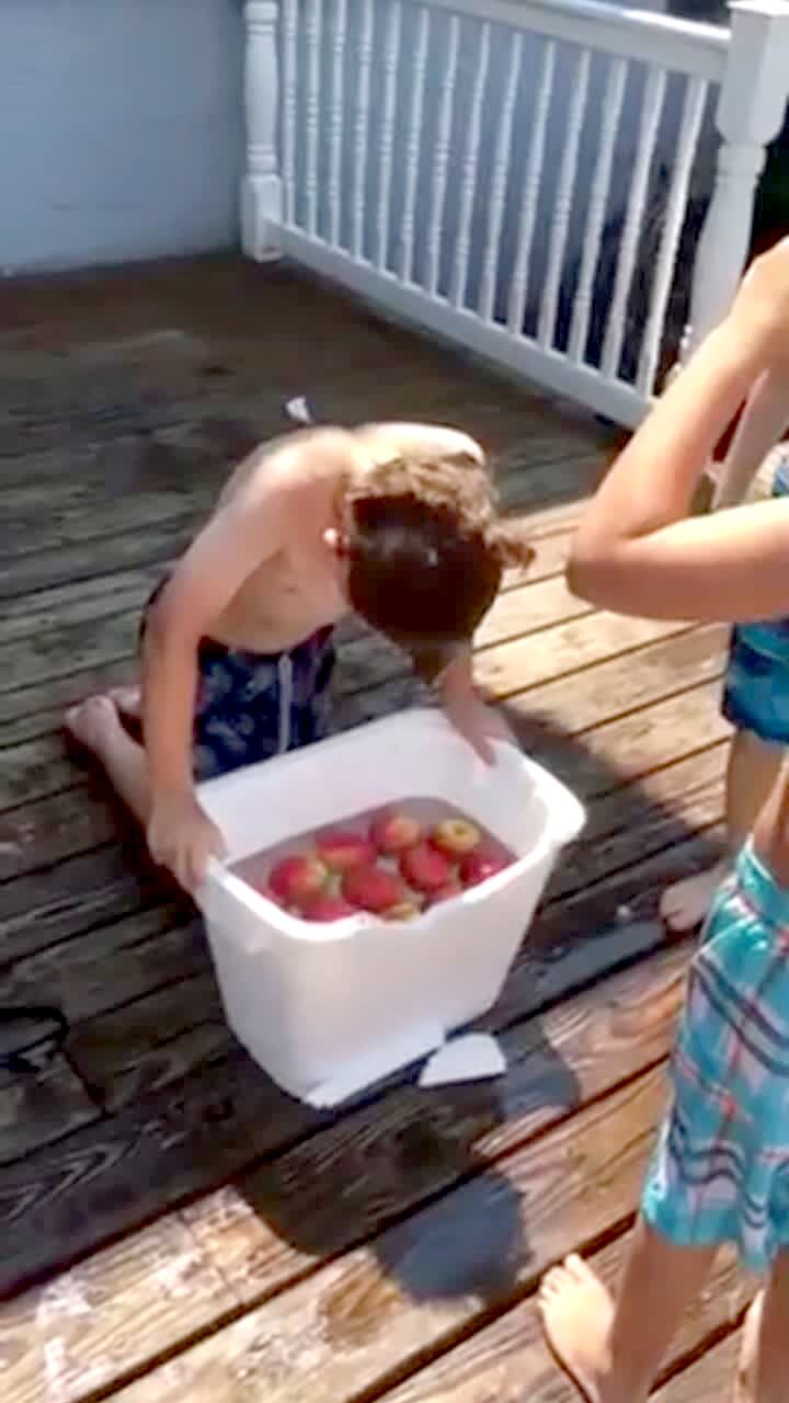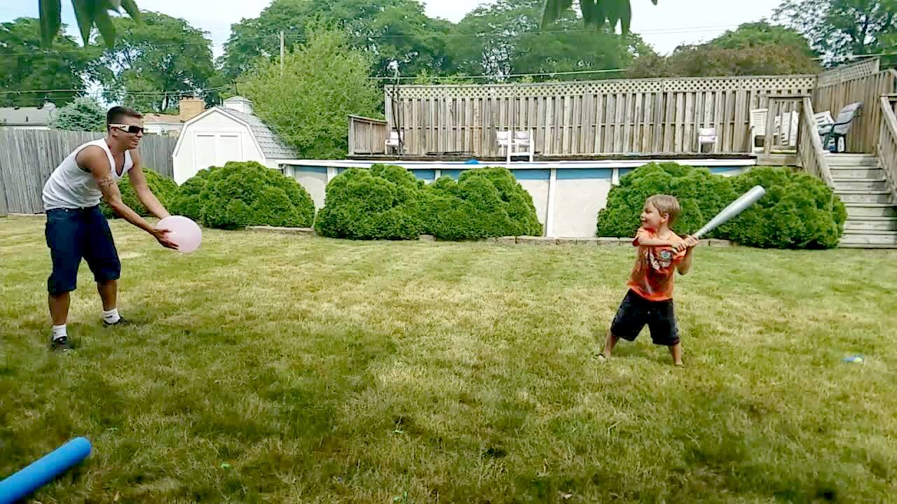 A young boy misses hitting a large water balloon with a bat. The balloon hits him and knocks the boy down in slow motion. AA: Super Slo-Mo Water Balloon