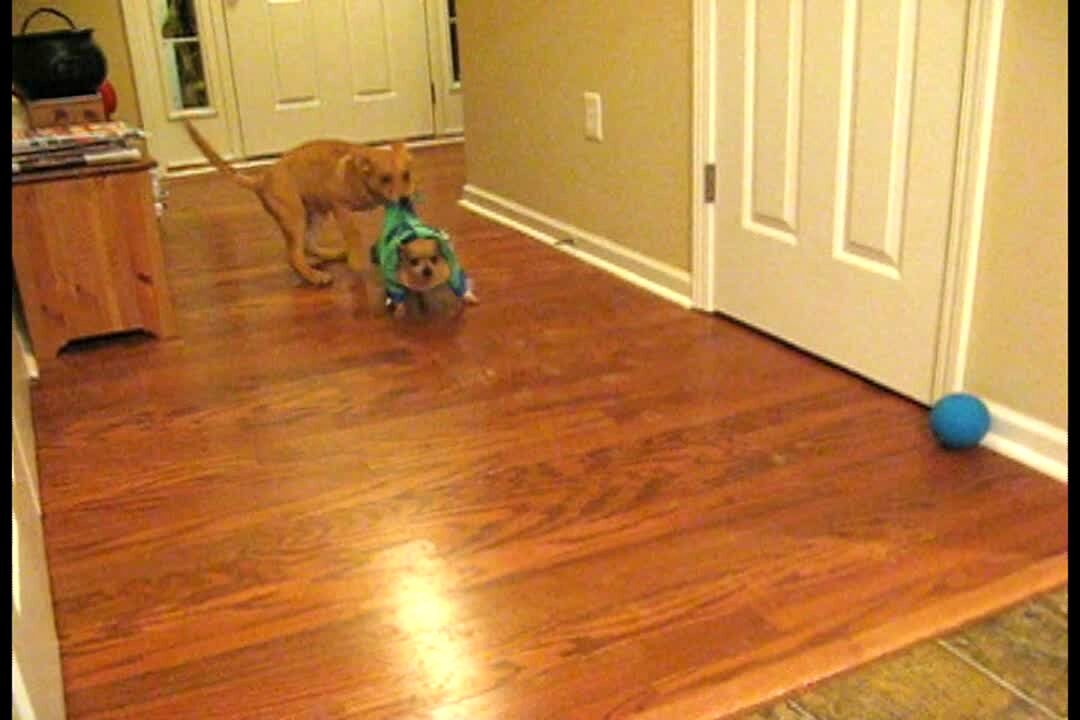 Bigger dog pulls Chihuahua by his dinosaur costume backwards around the kitchen floor. Halloween. Funny visual. Video gets very grainy & dark. SAME CLIP ON 4K-18 @ 18:25:48.