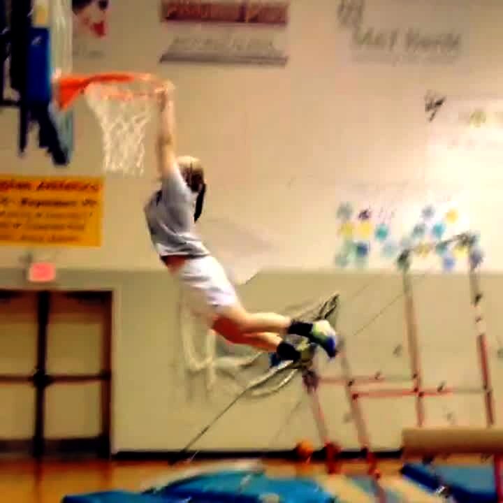 A young girl jumps into a swimming pool and lands on her older sister's face.