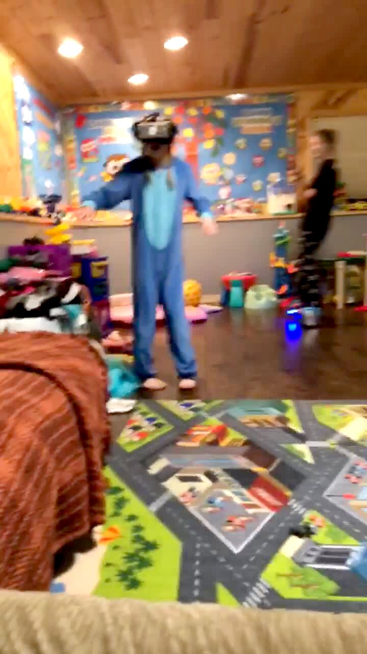 A young girl puts a cookie on her face in a kitchen and tries to do the cookie face race, but a young boy wears a mask and yells behind her, then she screams and the cookie falls off of her face.