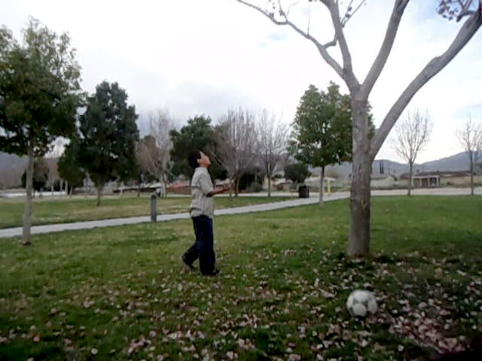 A young boy throws a coke bottle on the street outdoors, and it rockets up into the sky.
