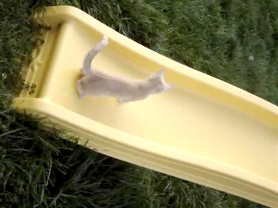 A kitten cat runs from two dogs outdoors and jumps over a fence then bounces off a shed.