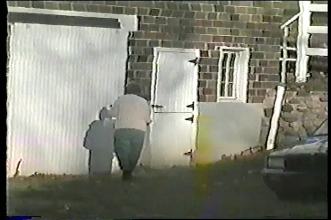 A cat breaks through a glass patio door and dashes across a yard. Security footage.