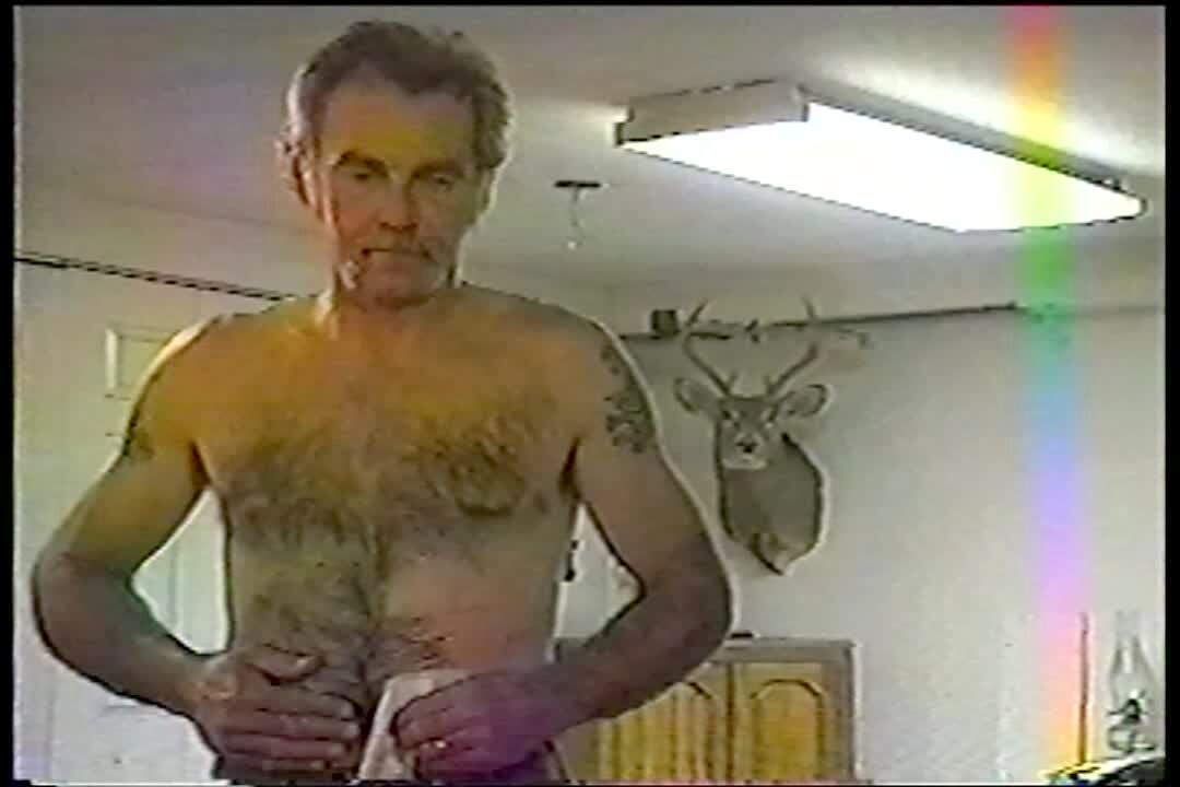 Man waxes his own chest alone in the basement. He pulls strips off yells. Has trouble getting 1 strip off looks pained. Mounted deer head in the background. Son comes in looks very confused at what dad is doing.