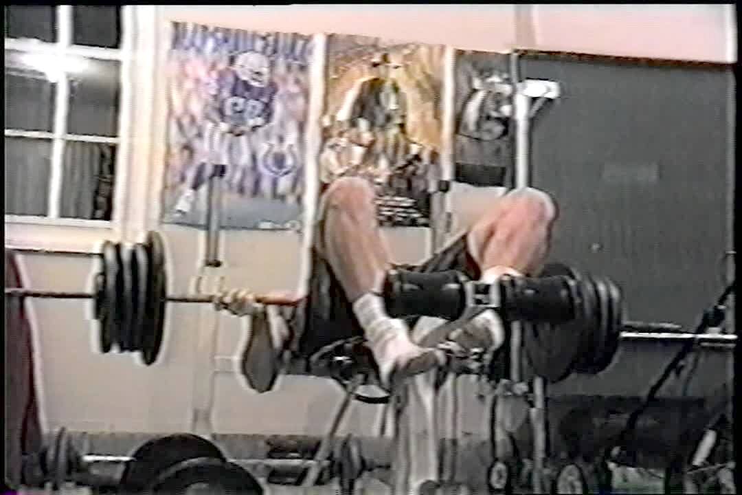 "Weight Problem" Man lifting weights, bench press, can't lift the weight off his chest and it is stuck there. He finally rolls it off, but holds groin as if he's hurt.