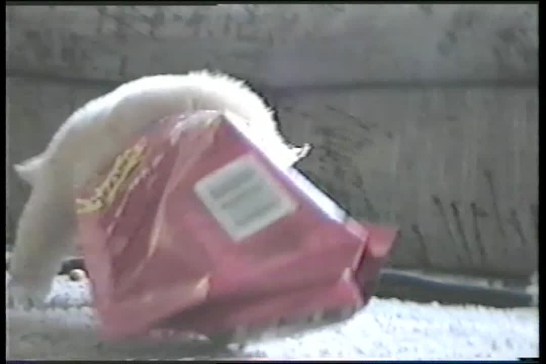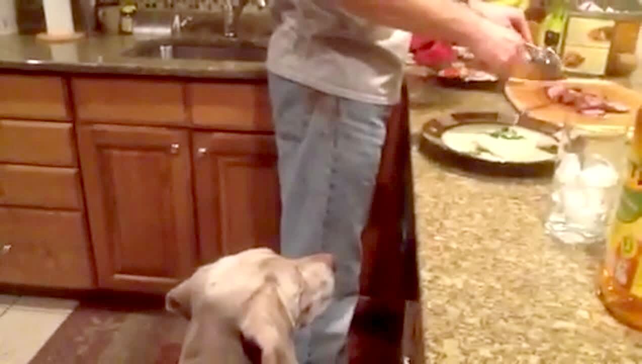 A dog jumps for a treat in slow motion but misses and makes a funny face.