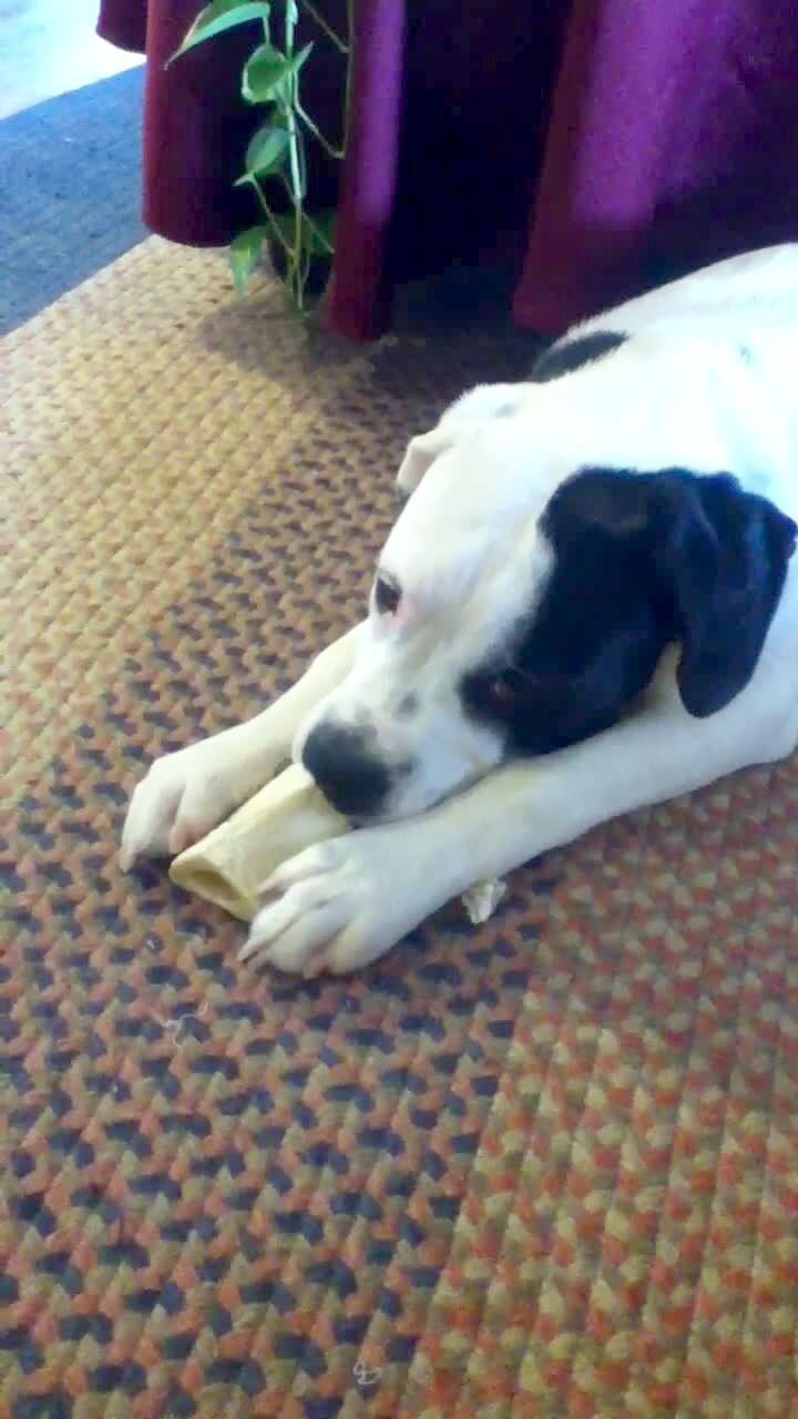 A dog licks the inside of a long, hollow bone and his tongue pokes out the other end.