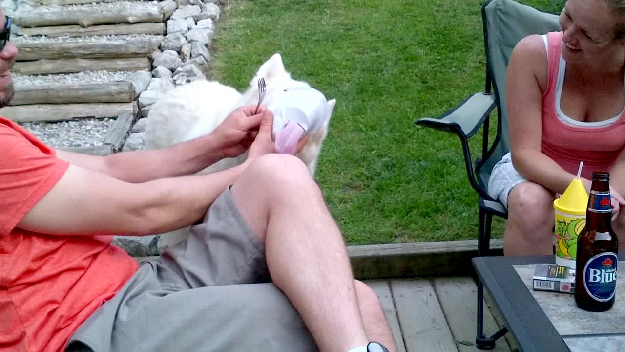 A dog repeatedly sticks its tongue through a hole in a paper bowl while a man holds it up outdoors.