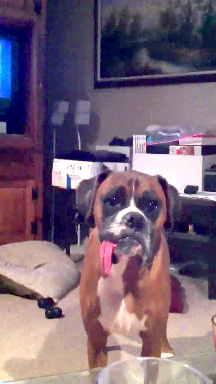 A dog with an absurdly long tongue tries to eat ice cream indoors. He has "hanging tongue syndrome".