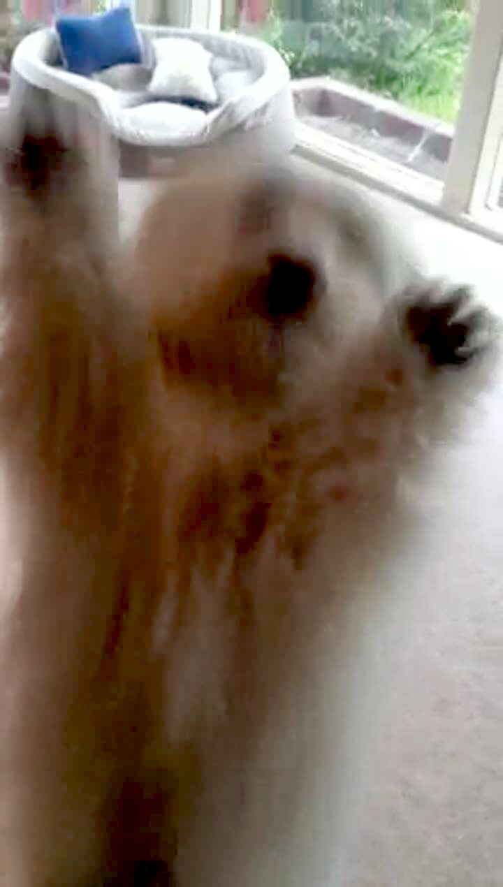 A dog begs for a treat. Puts both paws up in the air and hops up and down.