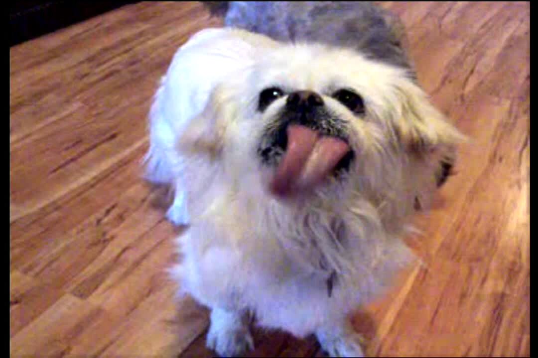 Small dog has freakishly long tongue when it licks things or lets it hang in the air. Funny visual.