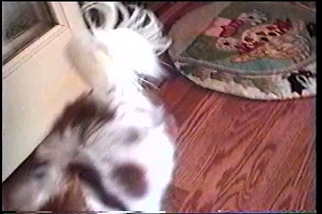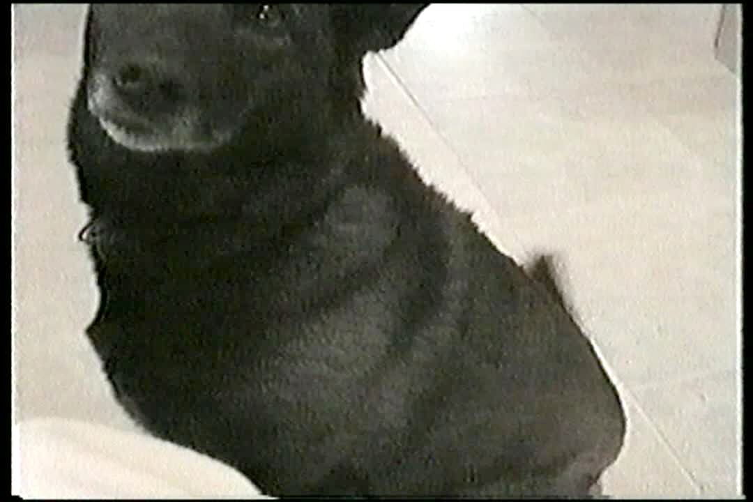 Black dog wags tail for "yes" to question "are you hungry?" and keeps tail still to answer "no" when asked "wanna go outside?" Silly pet tricks.
