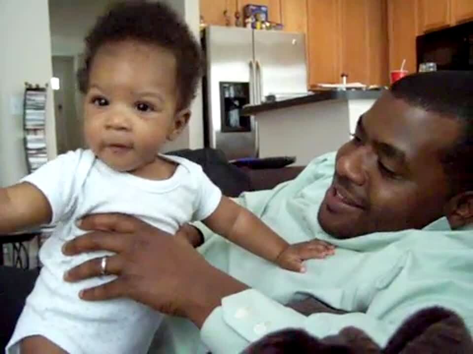 Baby boy has a funny / weird laugh when dad drops a toy on his lap.
