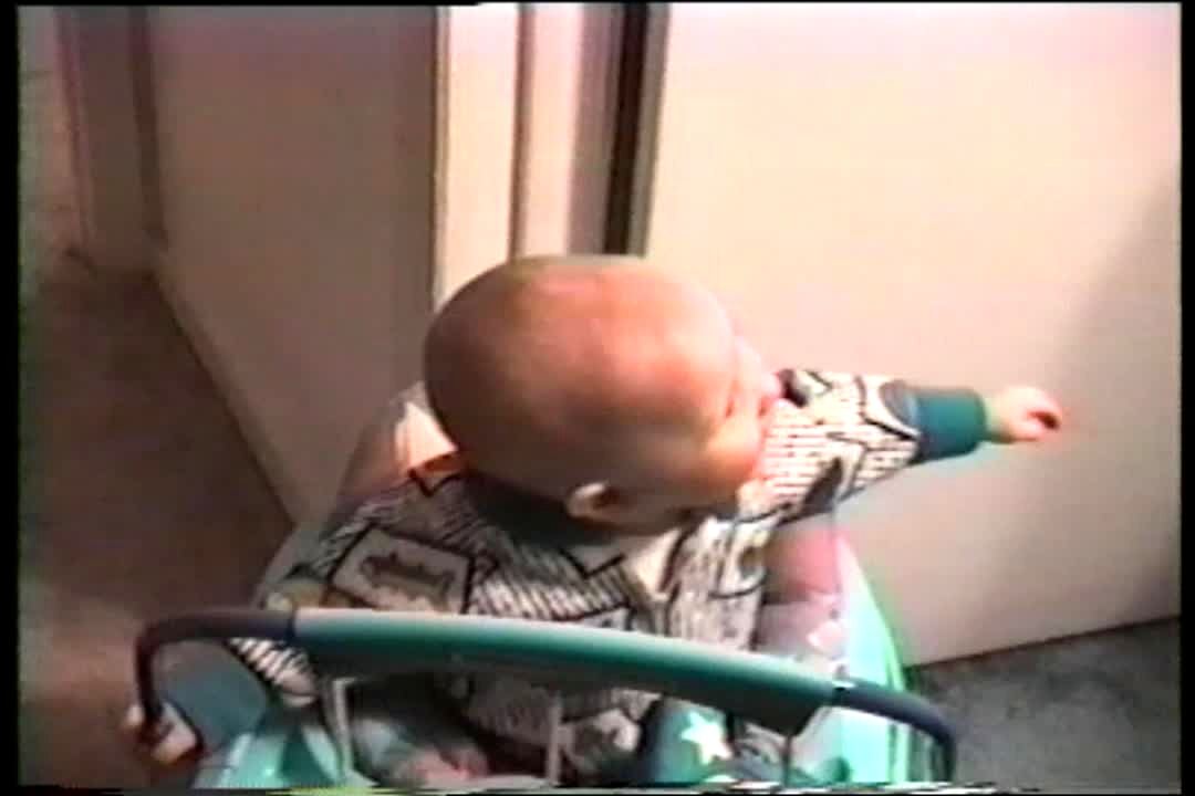 Dad gargles in bathroom doorway, baby boy in walker on the floor laughs hysterically. Baby jumps up and down to signal for Dad to make noises again. Giggles, cute.