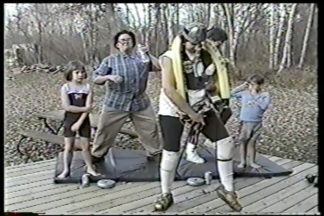 Woman falls into lake dancing on a dock with another woman. FAKE/SET UP