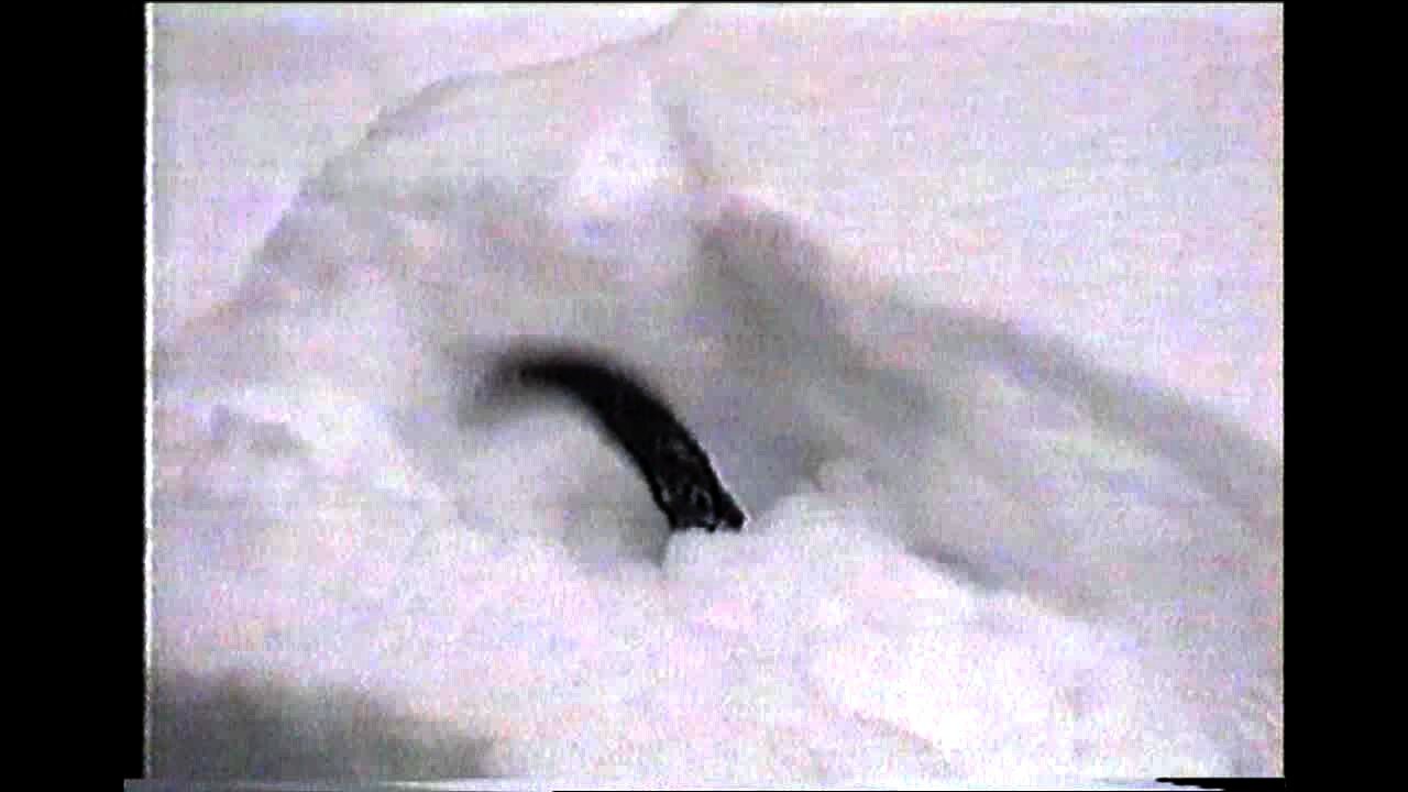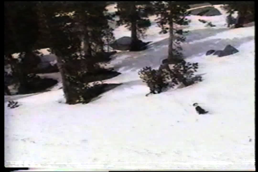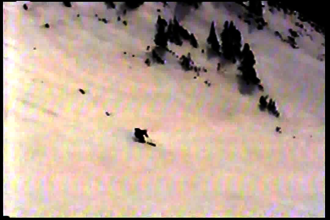 Dog comes tumbling down snow covered mountain. He does about 15 flips and then slides on his butt.