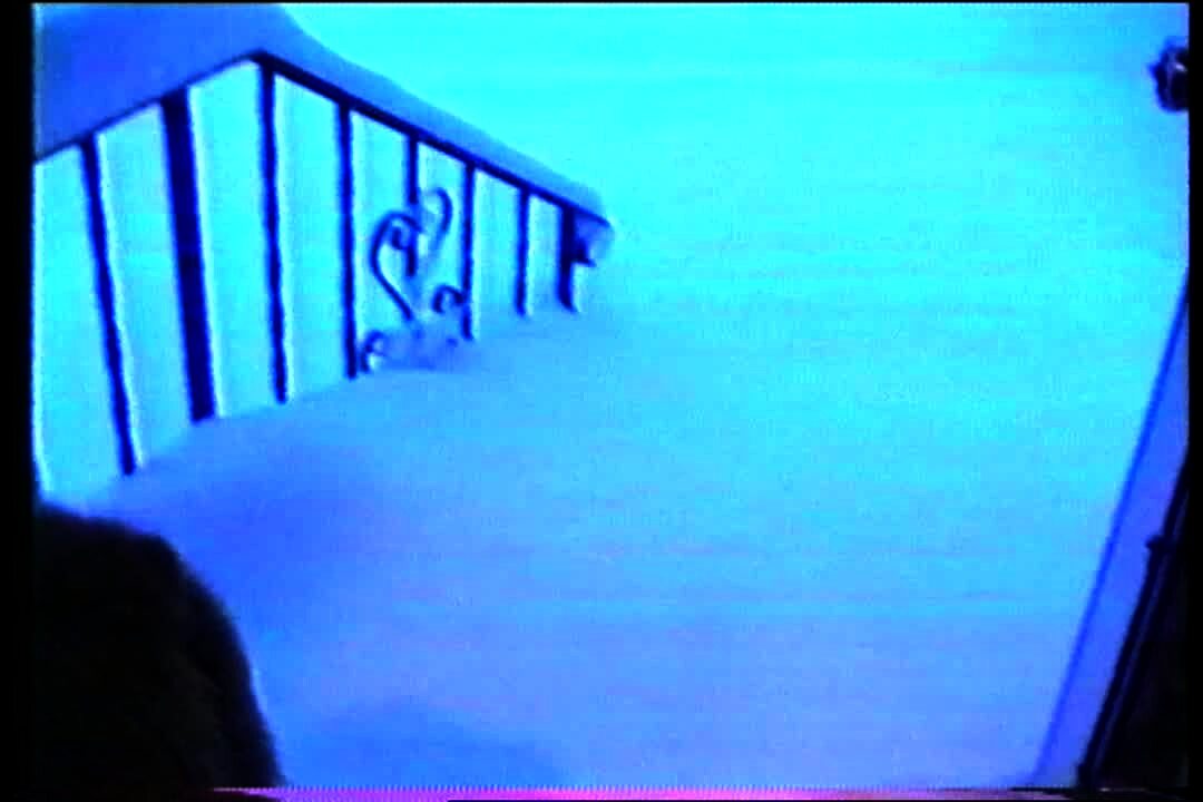 A small dog stands outdoors in the snow when a man tells her to come inside and she lifts one of her legs that's covered in snow balls and limps inside on three legs.