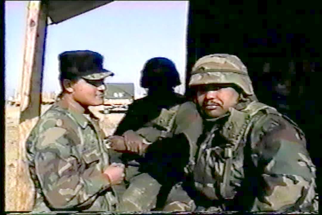 Soldiers made a wall out of duct tape across the door. One soldier runs into it and falls. Military, practical joke. Army.