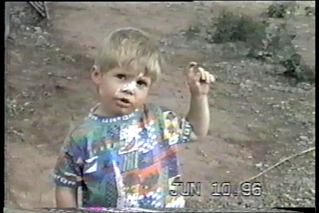 A bird pecks the back of a man's head twice while he films himself as he walks between a row of trees.
