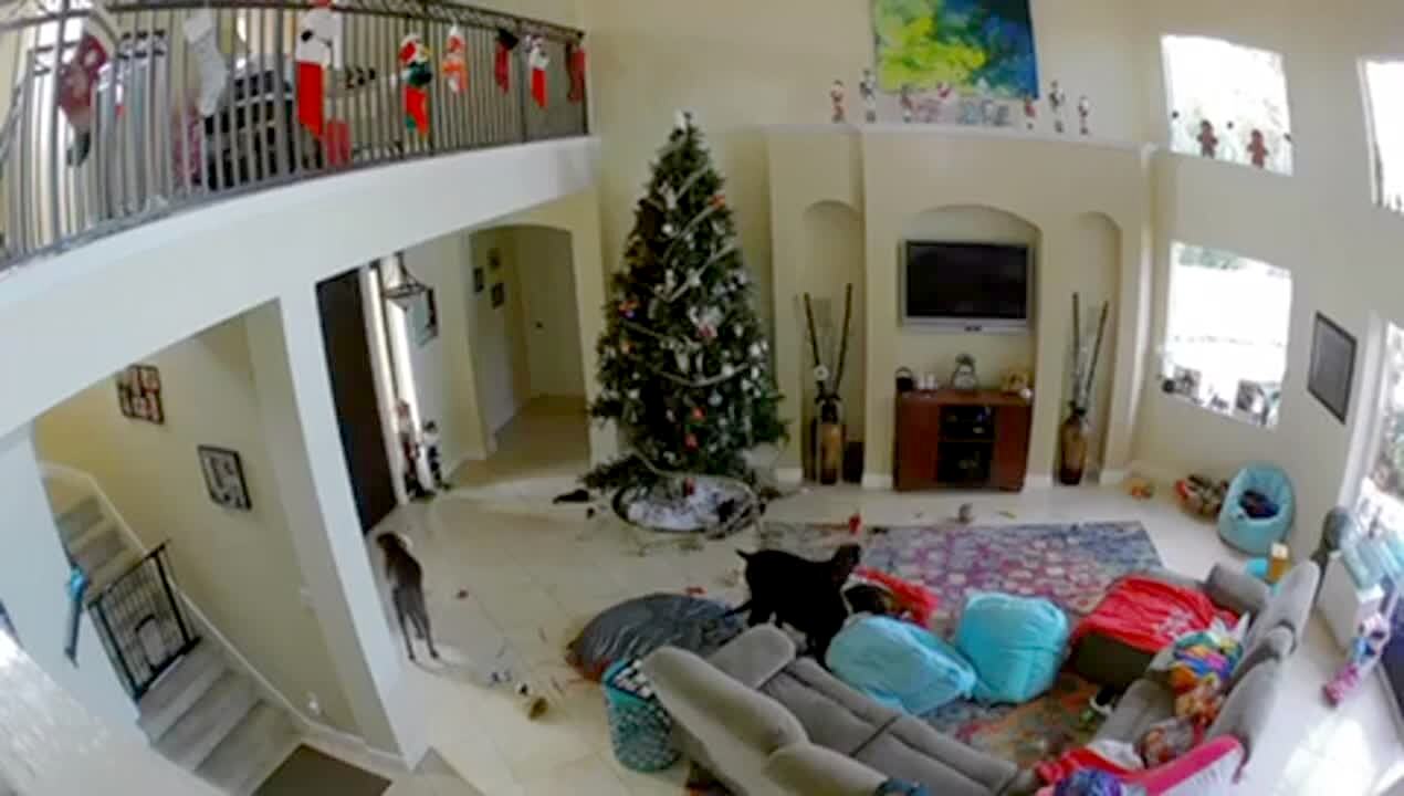 A teen girl tries to dance down a flight of stairs to the song Rockin Around the Christmas Tree and she slips and falls down the steps.