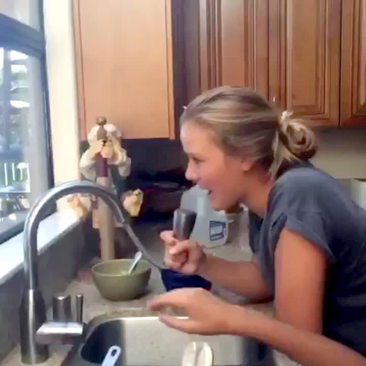 A teen girl sings to a song that plays while the huddles on the counter then she loses her balance and falls off and hangs off the cabinet door by her underwear in the kitchen.