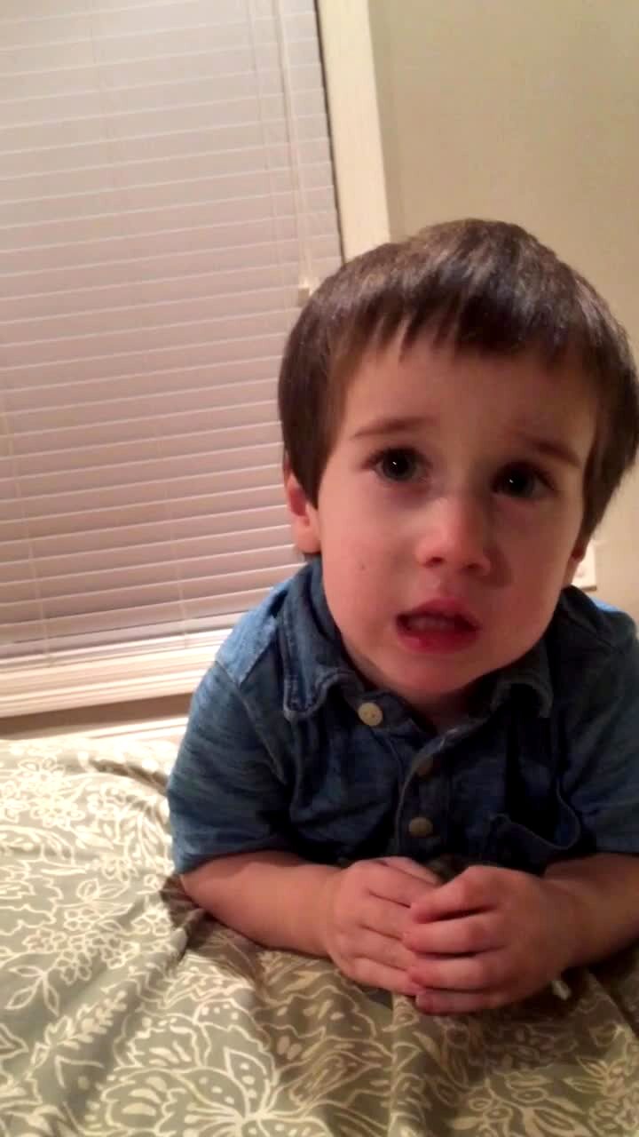 A boy dances for the camera indoors when his puppy dog walks behind him and he trips and falls over the dog.