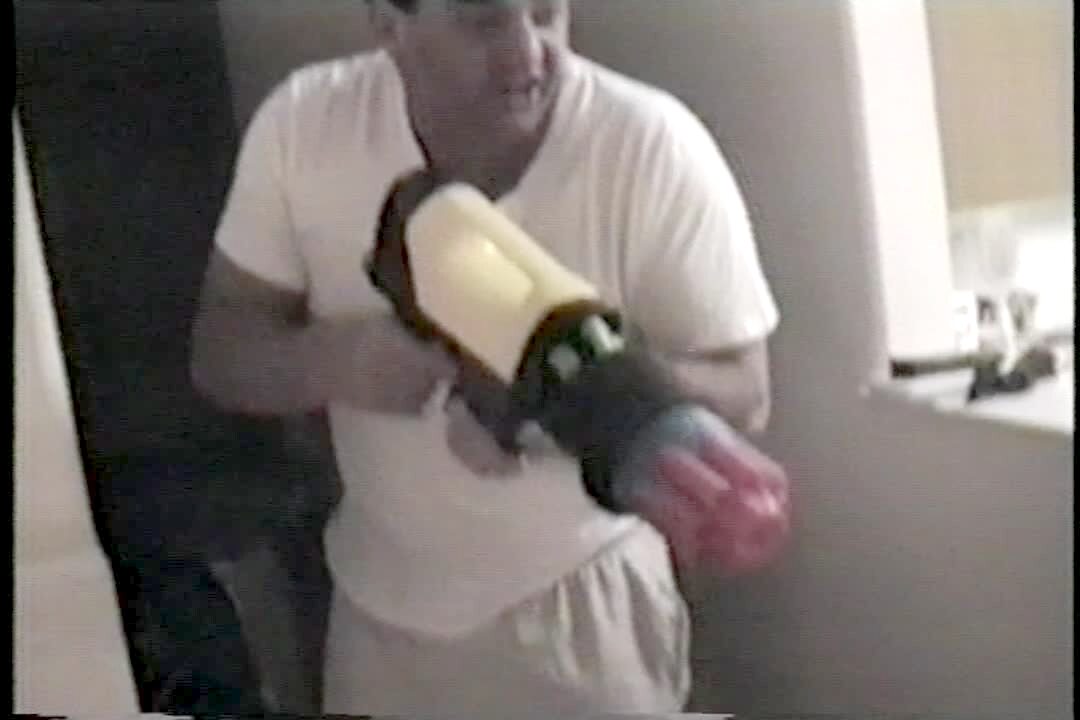 A young boy shows off his toy guns. At 3:20 the boy falls in to his toy box and the lid closes on him.