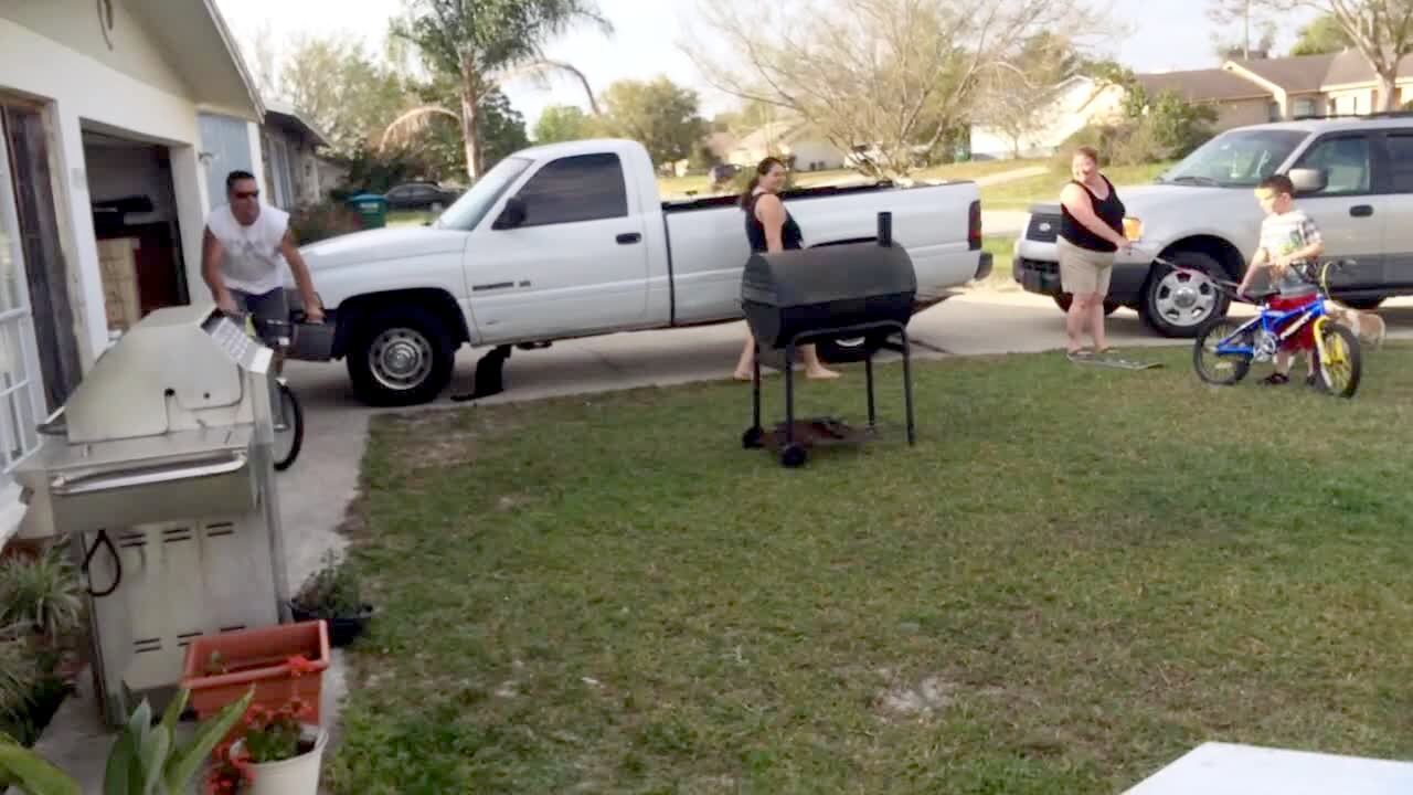 A man rides a bicycle over a homemade ramp and falls when the ramp breaks. Two women and two boys are visible.
