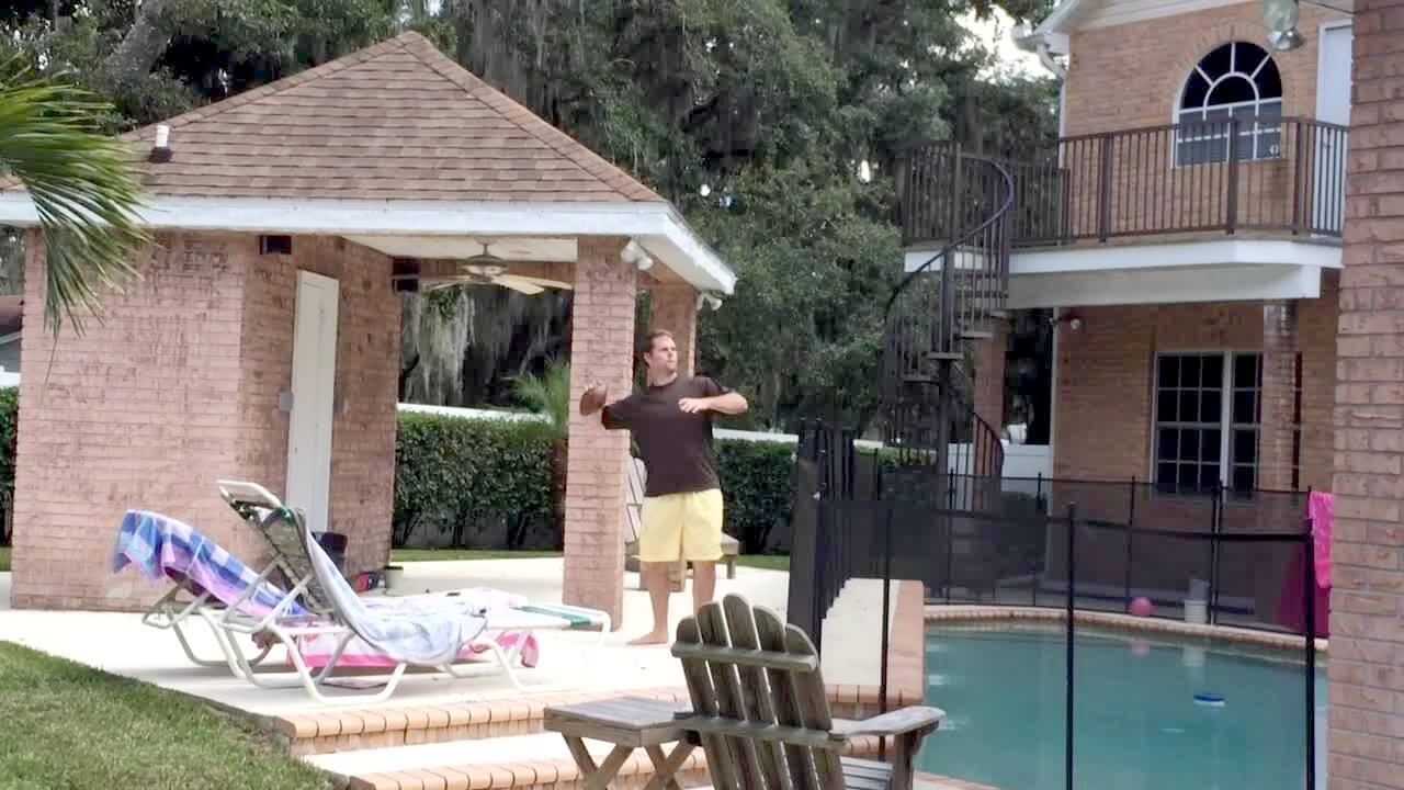 A black cat runs up behind a tan cat and pushes him into a swimming pool.