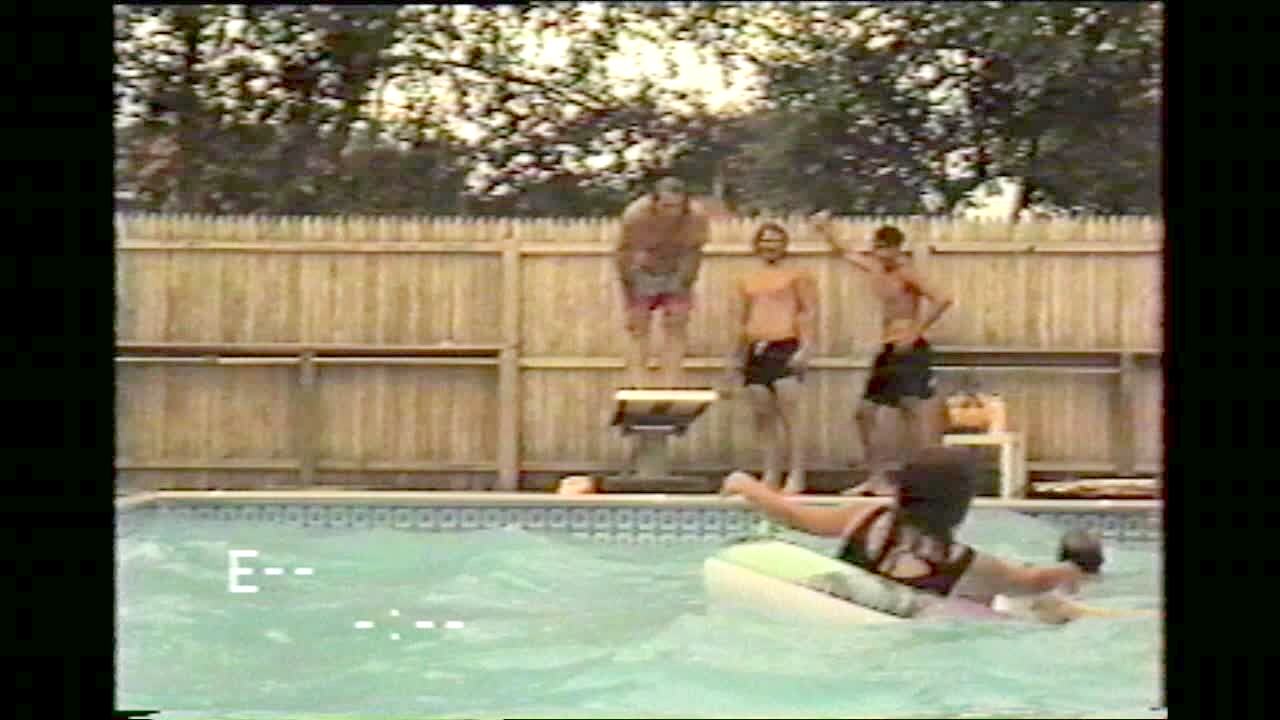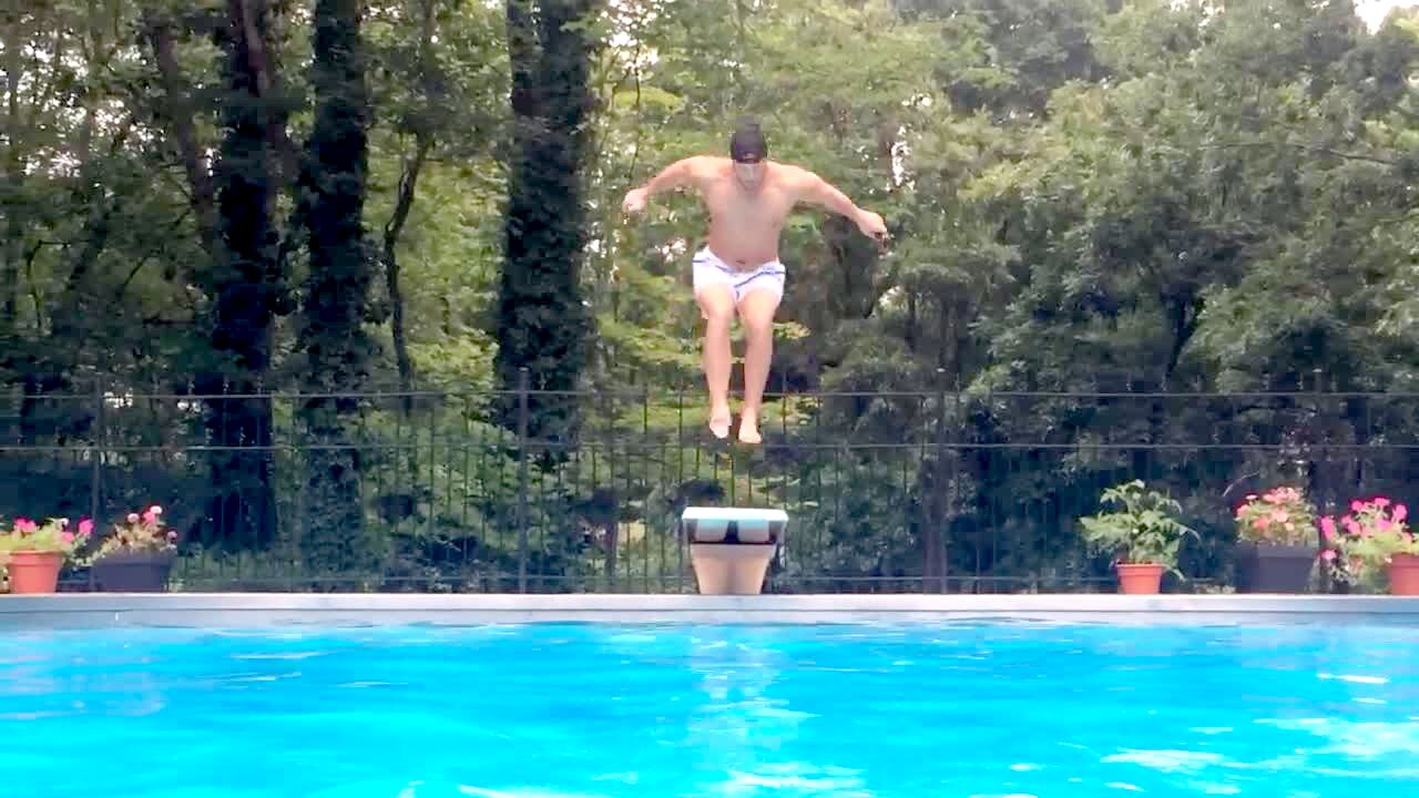 A man slips on a diving board and bounces into the water. Featured talent cleared only (the man who slips on the diving board).