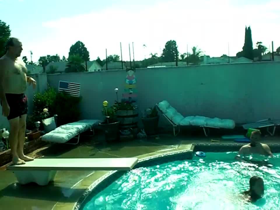 A man attempts to do his "famous butt dive," but as he attempts to bounce off of the diving board, it snaps and topples over him in a swimming pool.