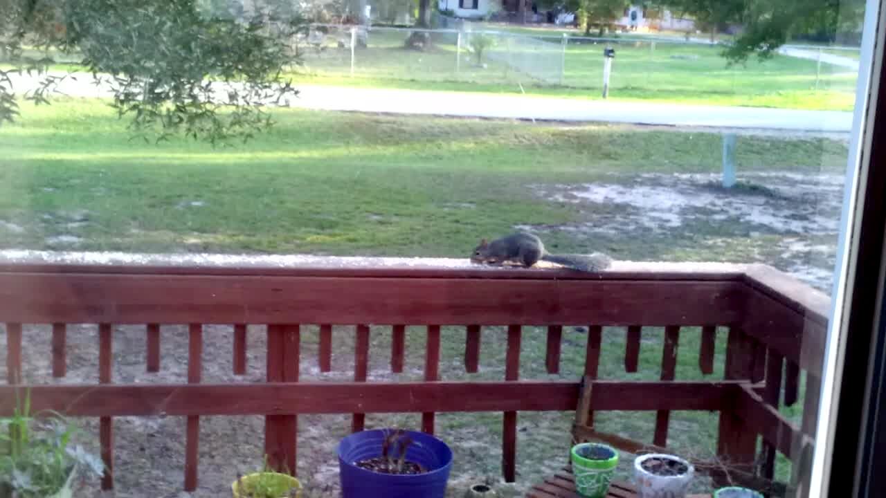 A squirrel eats birdseed on back porch and jumps off when person smacks screen door.