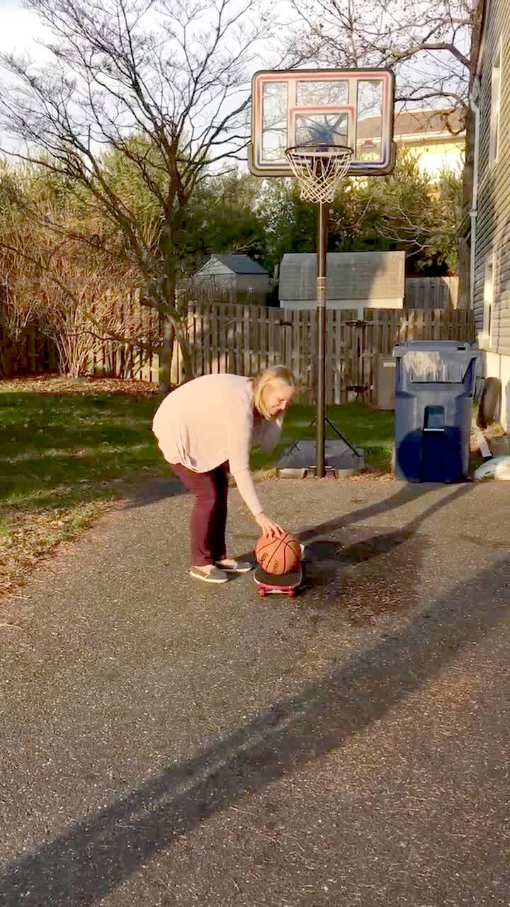 A boy drops a tennis ball on top of a basketball at home and the ball rebounds and hits him in the groin.