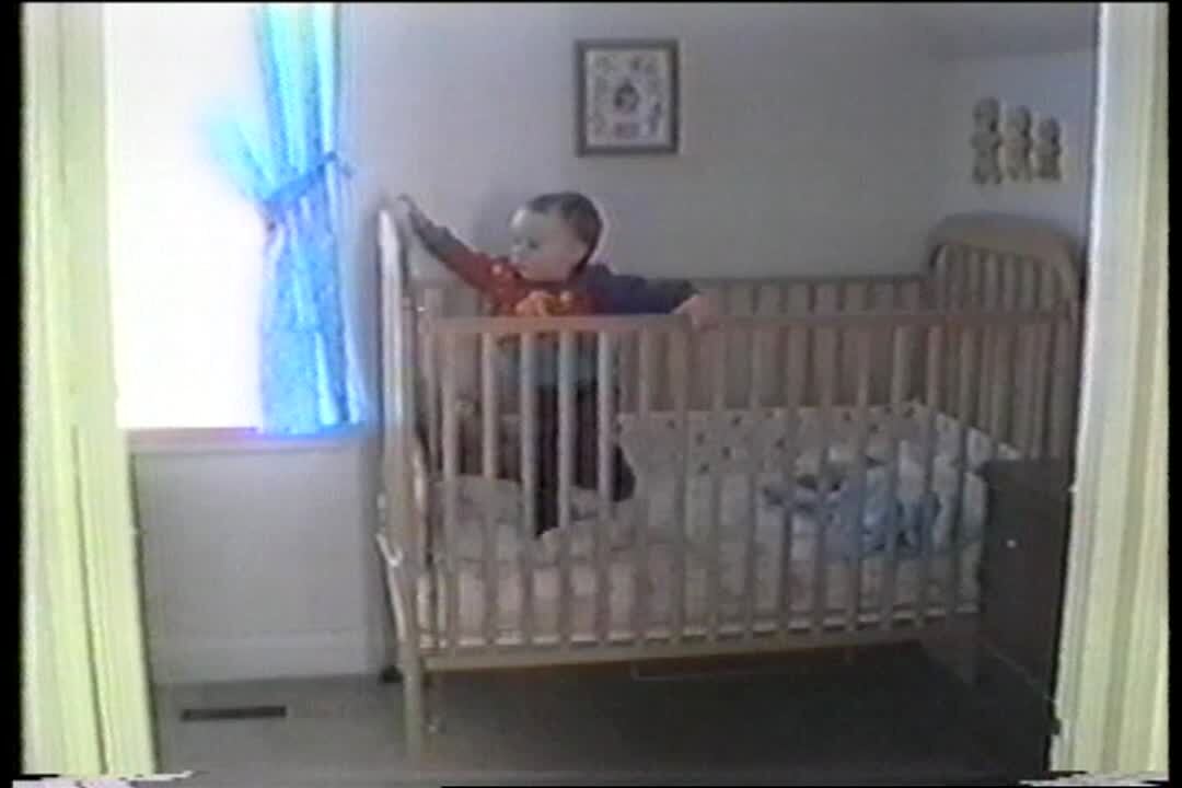 A baby boy leans against the outside of his tot brother's crib pen in the bedroom and the tot boy climbs up on the top of the wall and flips over and falls out.
