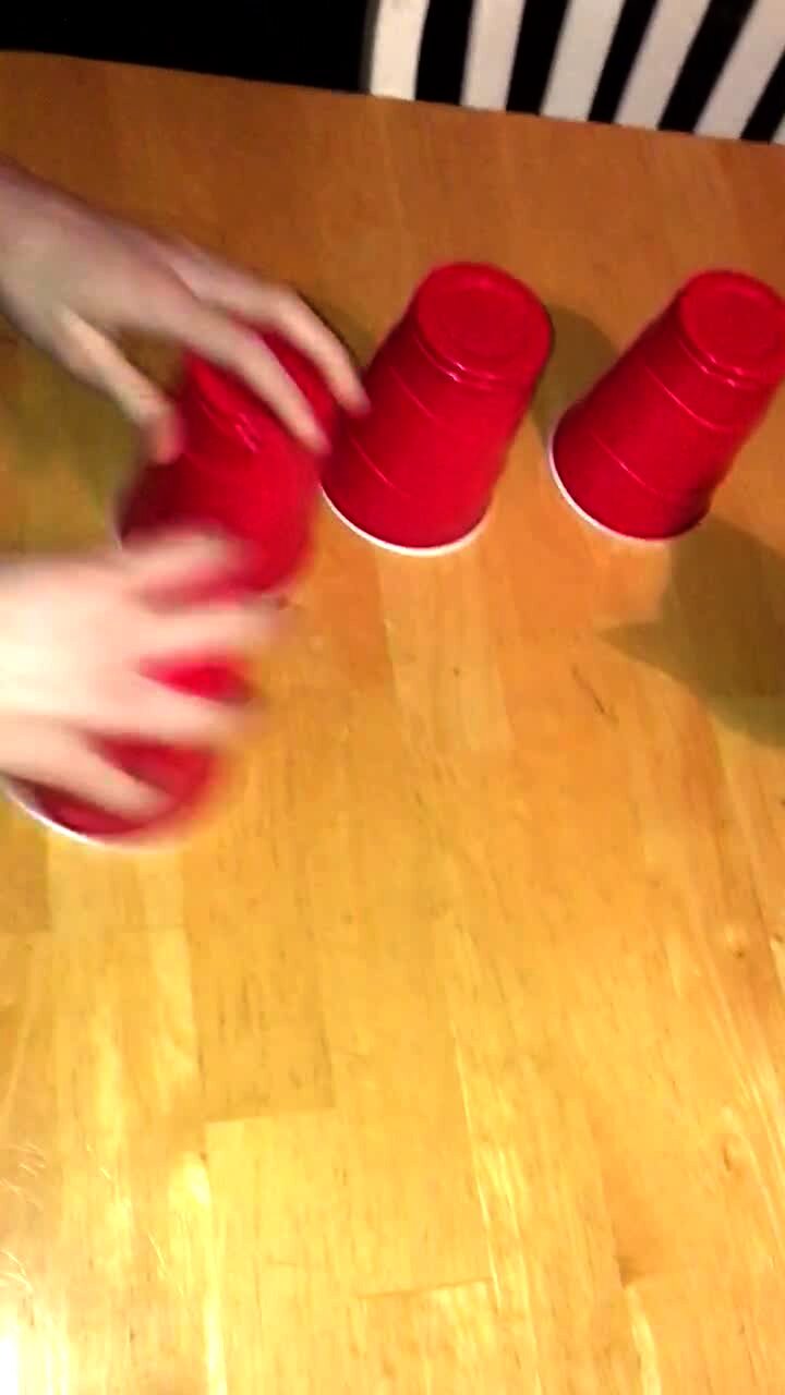 A teen girl dances in a living room, practicing a cheerleader cheer. She jumps and hits her hand on a ceiling light, knocking the light off the ceiling and breaking it.